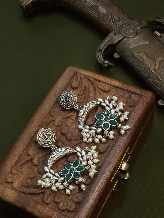 Handcrafted Green Stone Oxidised Silver Chandbali Earrings
