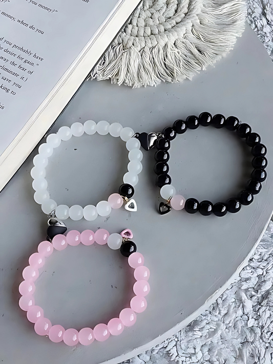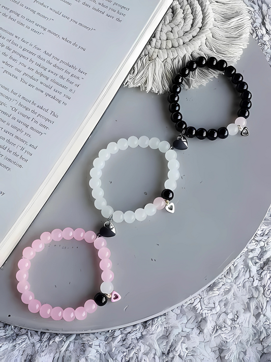 Black, Pink and White Trio Heart Charms Beaded Magnetic Bracelets