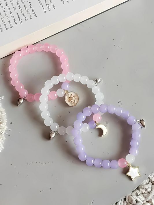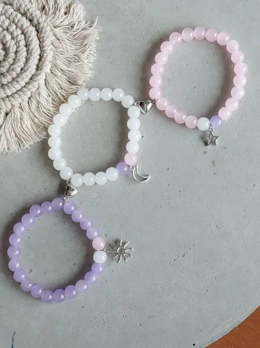 Pink, White and Purple Beaded Trio Friendship Charm Bracelets