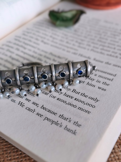 Make a bold statement with our "Blue Stone Studded Big Oxidised Silver Finger Ring." Crafted to perfection, this stunning piece combines the elegance of oxidized silver with the allure of vibrant blue stones. The eye-catching design and sizable ring make it the perfect accessory to elevate your style with a touch of grandeur.