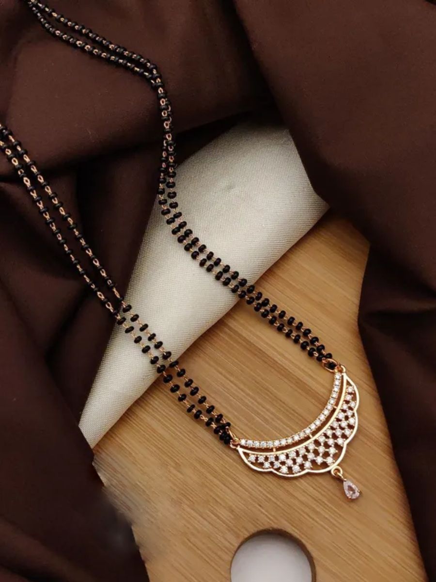 Enhance your traditional look with our Designer American Diamond Pendant Short Mangalsutra. Crafted with rose gold plating and adorned with American Diamonds, this designer piece will add a touch of elegance to any outfit. Perfect for women, it's a must-have in your jewelry collection. Order now and elevate your style!