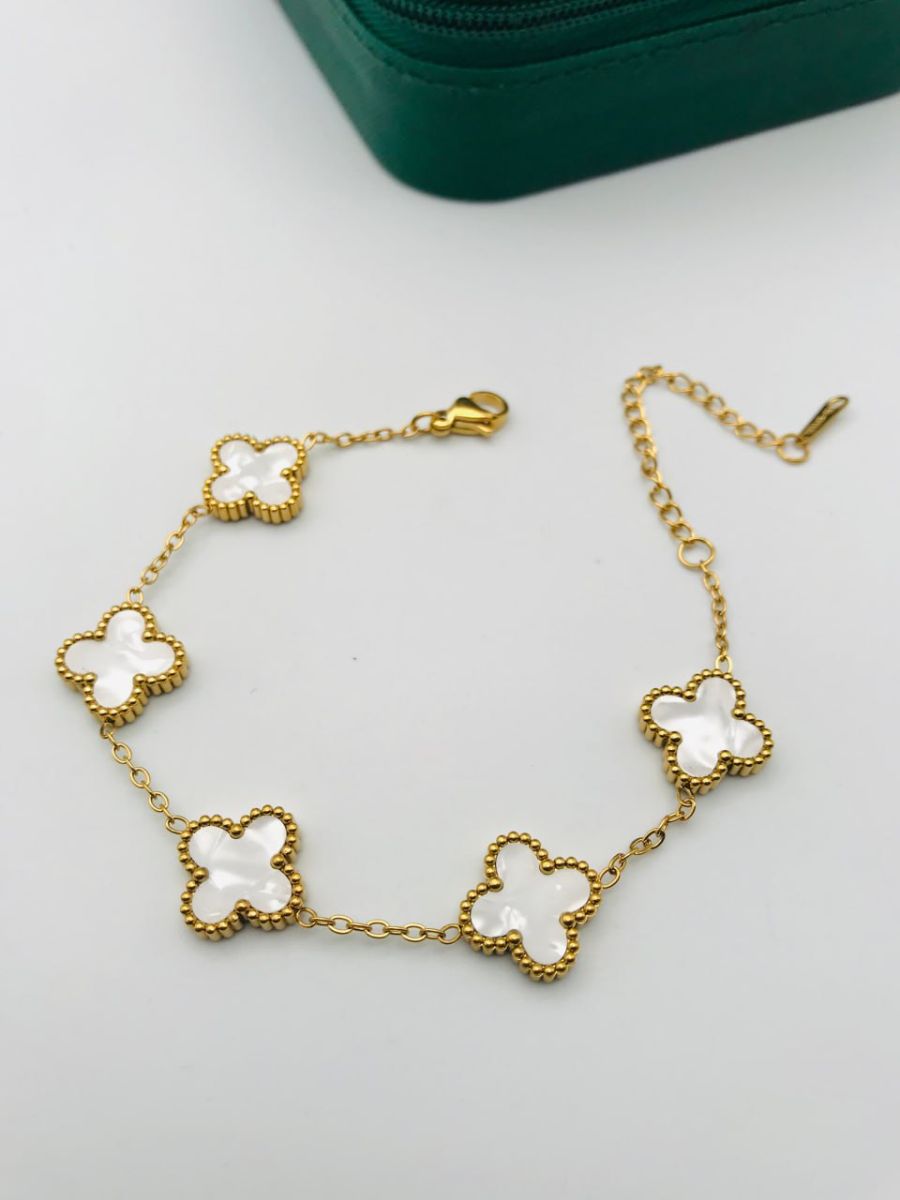 Five of White Pearl Enamelled Clover Charms Golden Bracelet