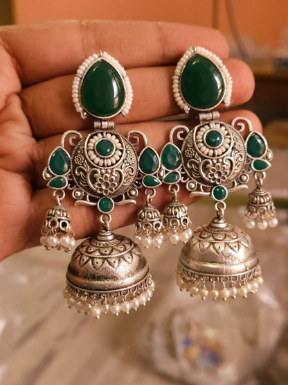 Green Color Big German Silver Oxidised Jhumka Earrings
