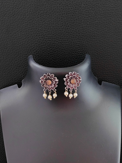Peach Flower Shaped Oxidised Silver Necklace Set with Earrings