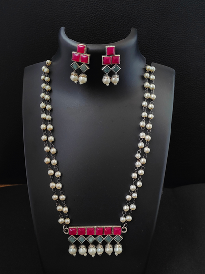 Pink and Sea Green Stone Long Oxidised Pearl Necklace Set