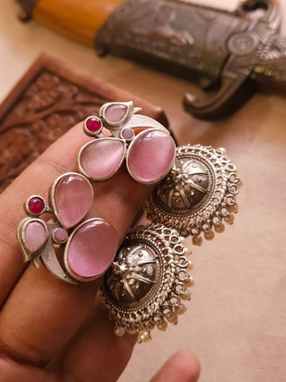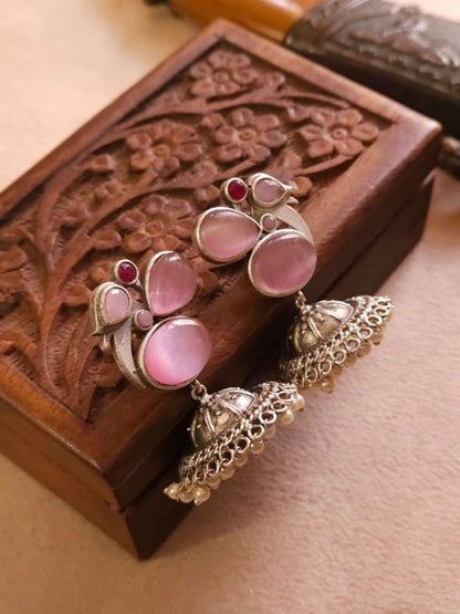 Pink Stones Small Oxidised Silver Jhumka Earrings