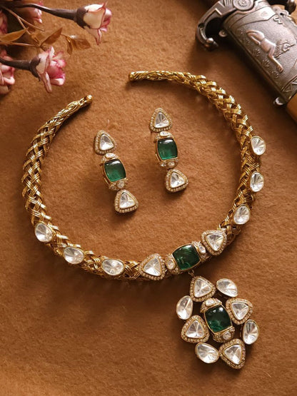 Premium Quality Green Stones Polki Kundan Hasli Necklace Set