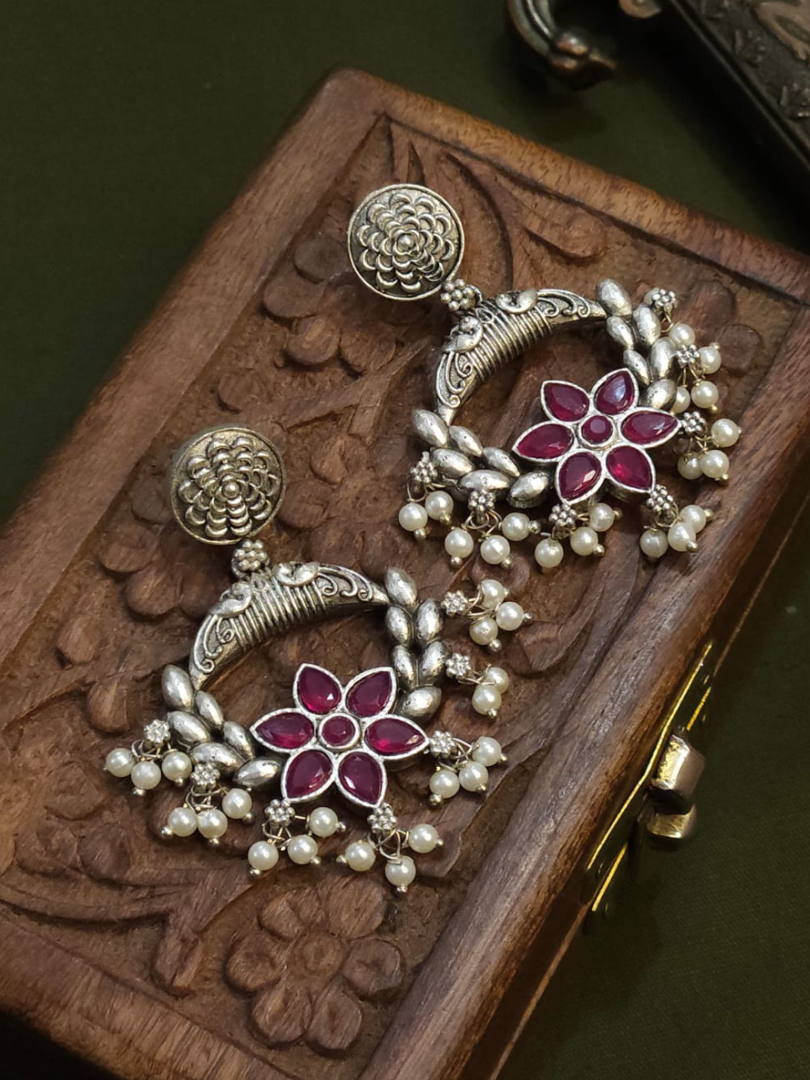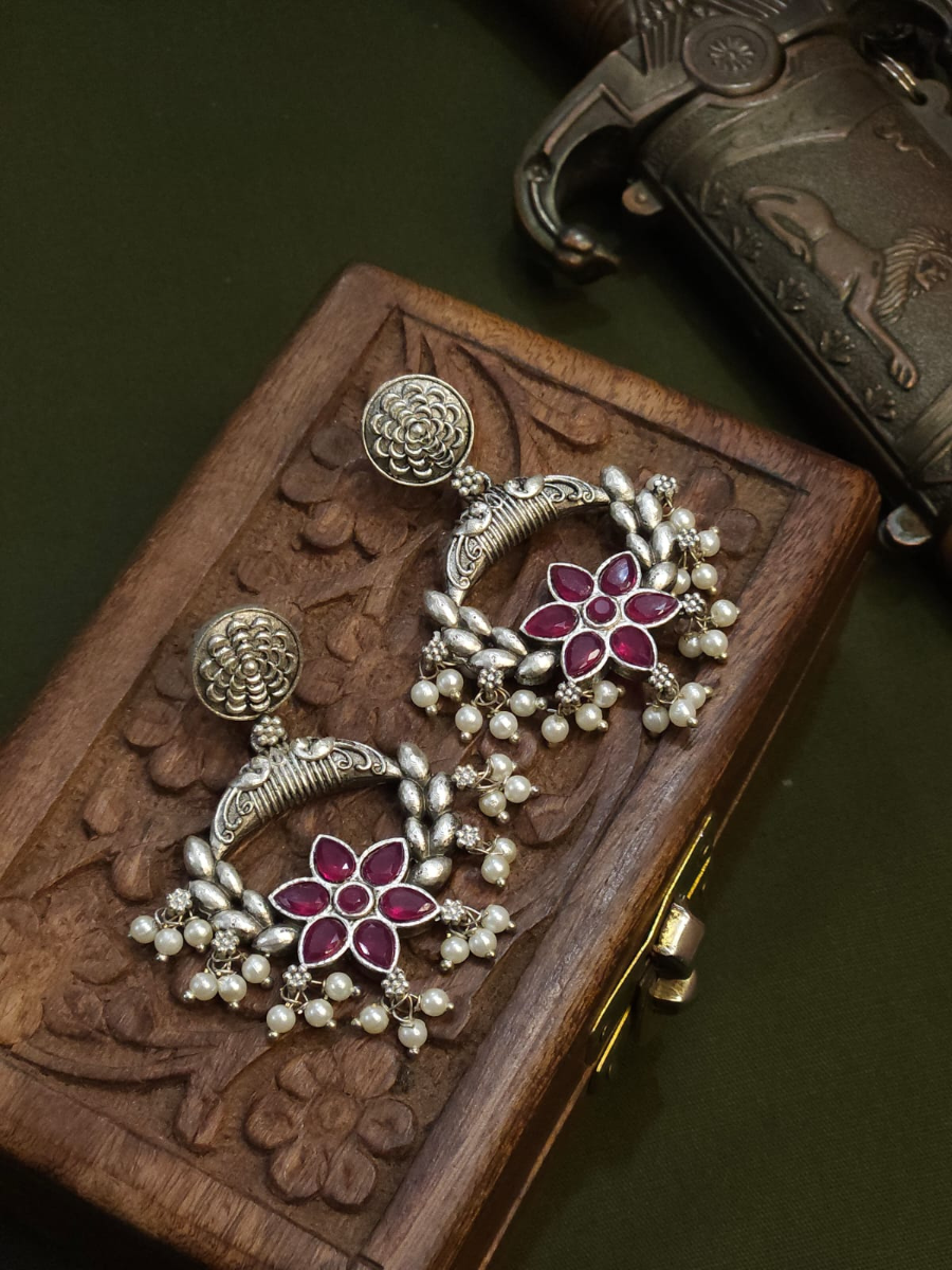 Rani Pink Stones Studded Oxidised Silver Dangler Earrings