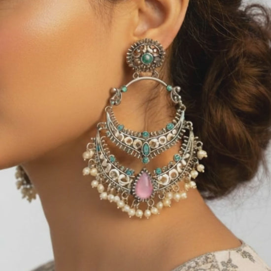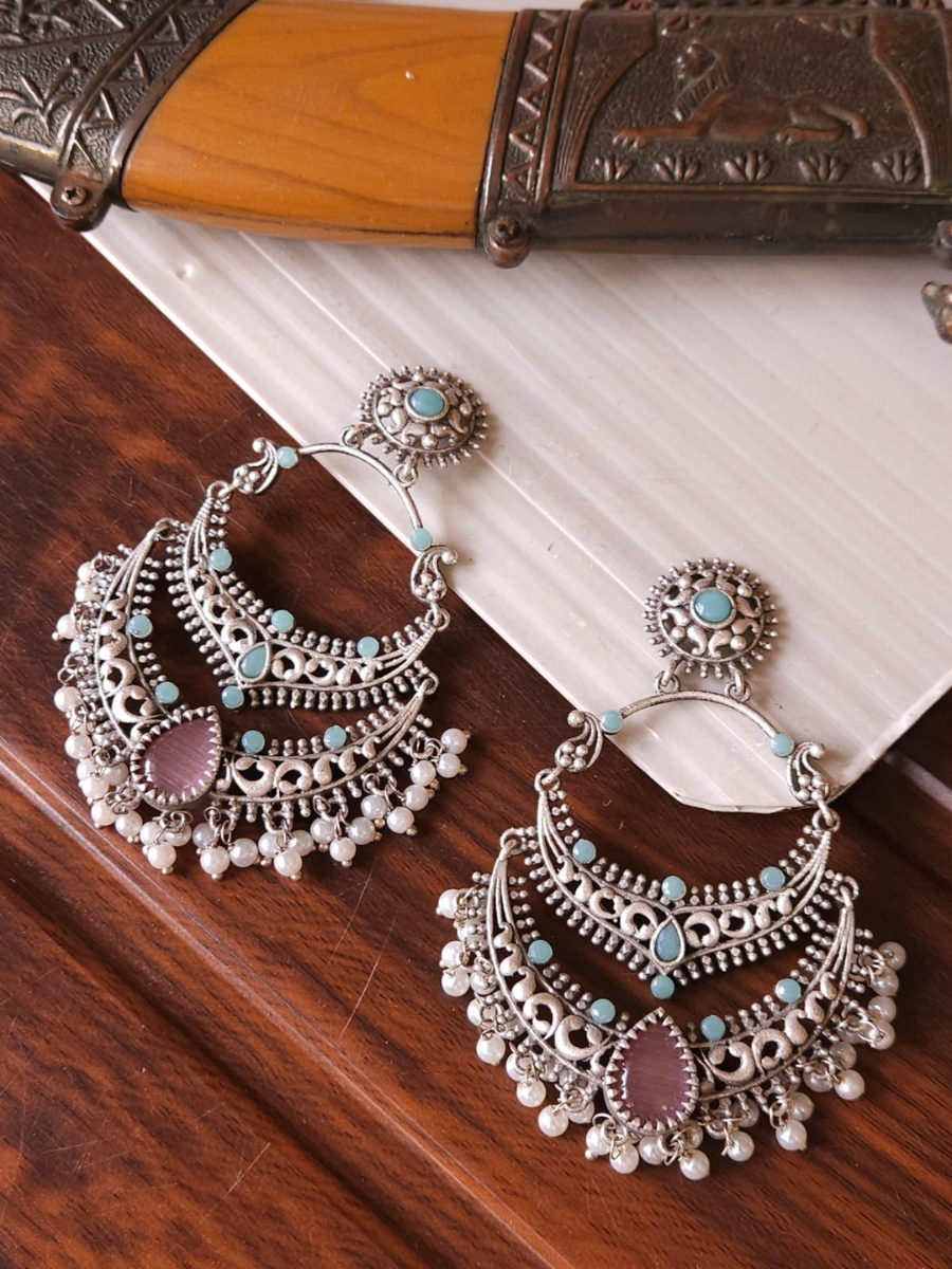 Sky Blue and Pink Stone German Silver Oxidised Chandbali Earrings