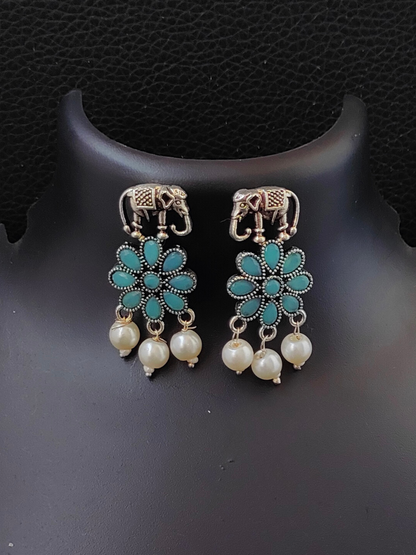 Sky Blue Flower and Elephant Shaped Oxidised Silver Necklace Set