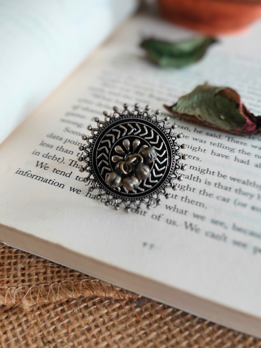 This silver finger ring is a Gungroo-style piece that is small in size and oxidized for a timeless look. Perfect for adding a subtle touch of style to your ensemble.