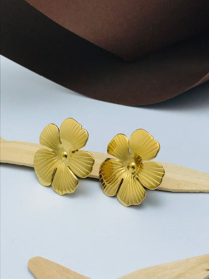 Upgrade your style with these elegant and trendy flower shaped stud earrings. Made from durable stainless steel and beautifully gold plated, these Korean style earrings add a touch of sophistication to any outfit. Complete your look with these must-have accessories.