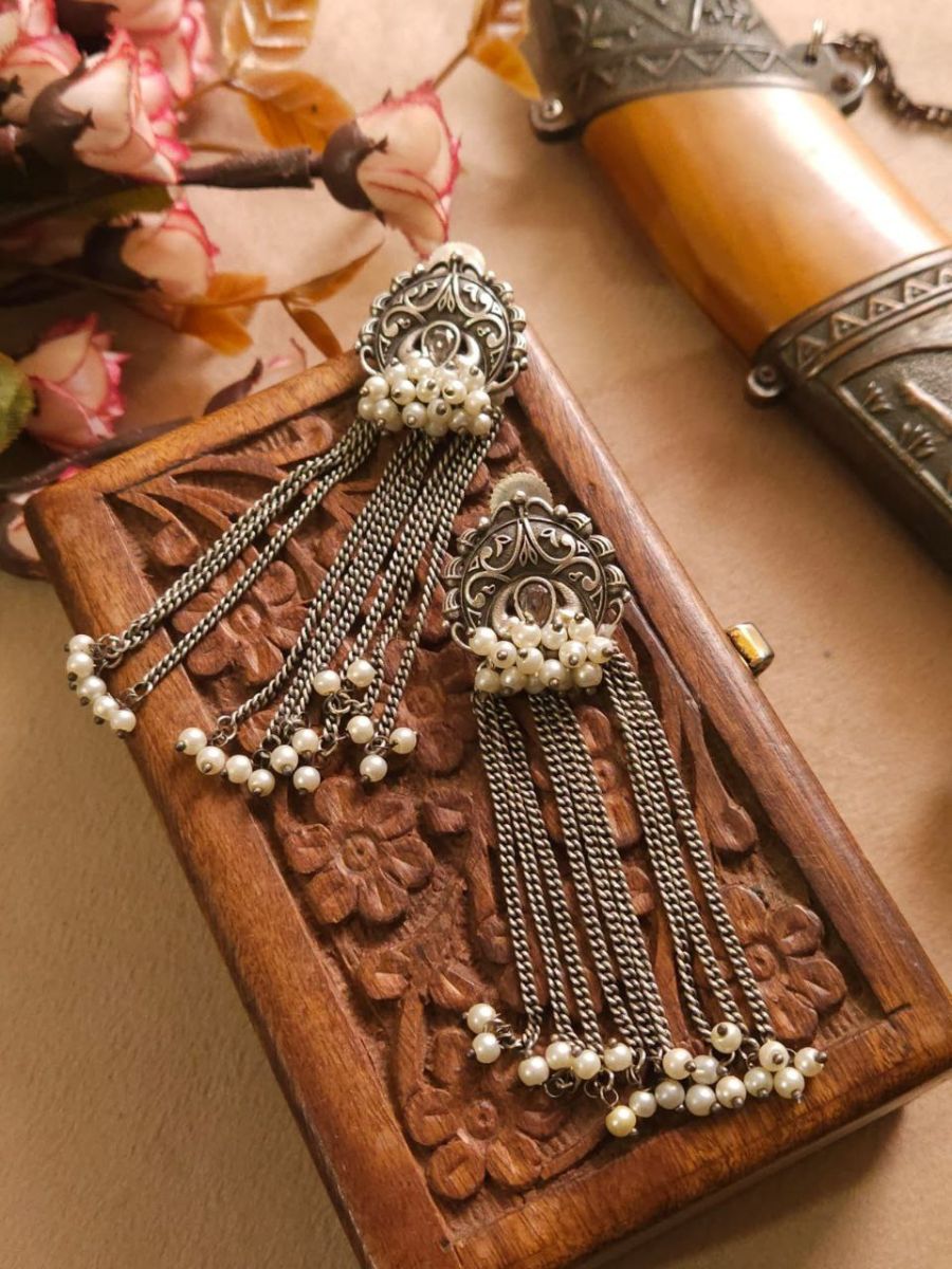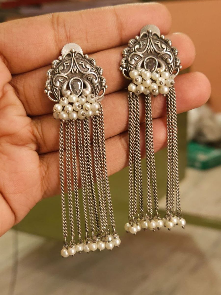 Stylish Oxidised Silver Long Chain Drop Pearl Earrings