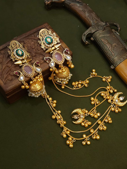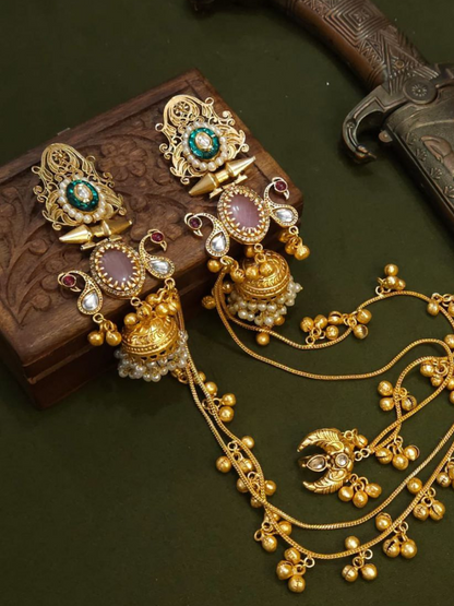 Traditional Baby Pink Stone Long Golden Jhumka with Earchain