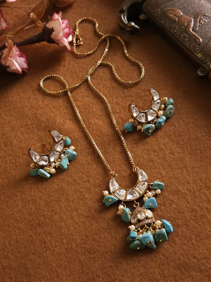 Turquoise Stones Polki Kundan Long Chain Necklace Set
