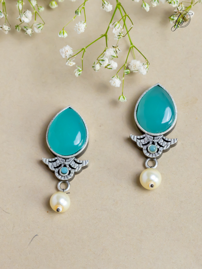 Sea Green Stone Studded Oxidised Silver Stud Earrings